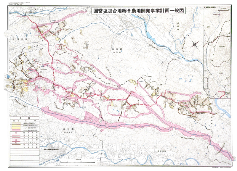 このため塩那台地の山林等のうち、開拓適地と、これら山林等に介在する既畑、および水田を対象に「国営総合農地開発事業」を実施し、農家の経営規模の拡大、農業生産基盤の整理を行い大型機械の導入を可能にし、労働生産性を高め、首都圏の近郊という立地条件を背景に農畜産物の供給基地として定着させ、農業経営の安定化をはかり、地域農業の振興に質するものである。